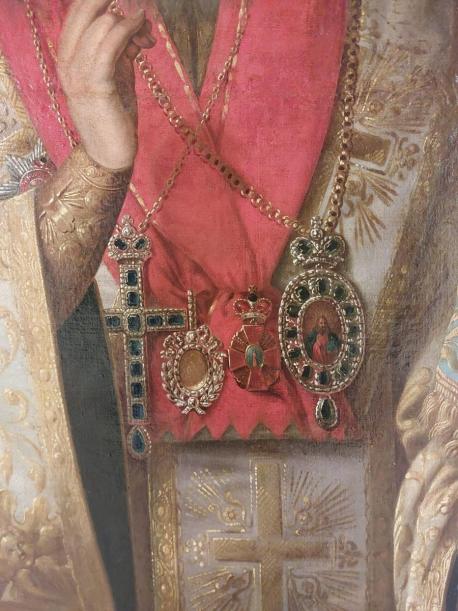 Peste sacos, ierarhul poartă omofor mare, împodobit cu broderie asemănătoare cu sacosul. Peste omofor, vlădica poartă două ordine străine (Ordinul otoman Nishan Iftihar și Ordinul rusesc Sfânta Ana, clasa I), prinse cu eșarfe de moar roșu, iar peste eșarfele acestor ordine, de o parte și de alta, se văd crucea pectorală și engolpionul.